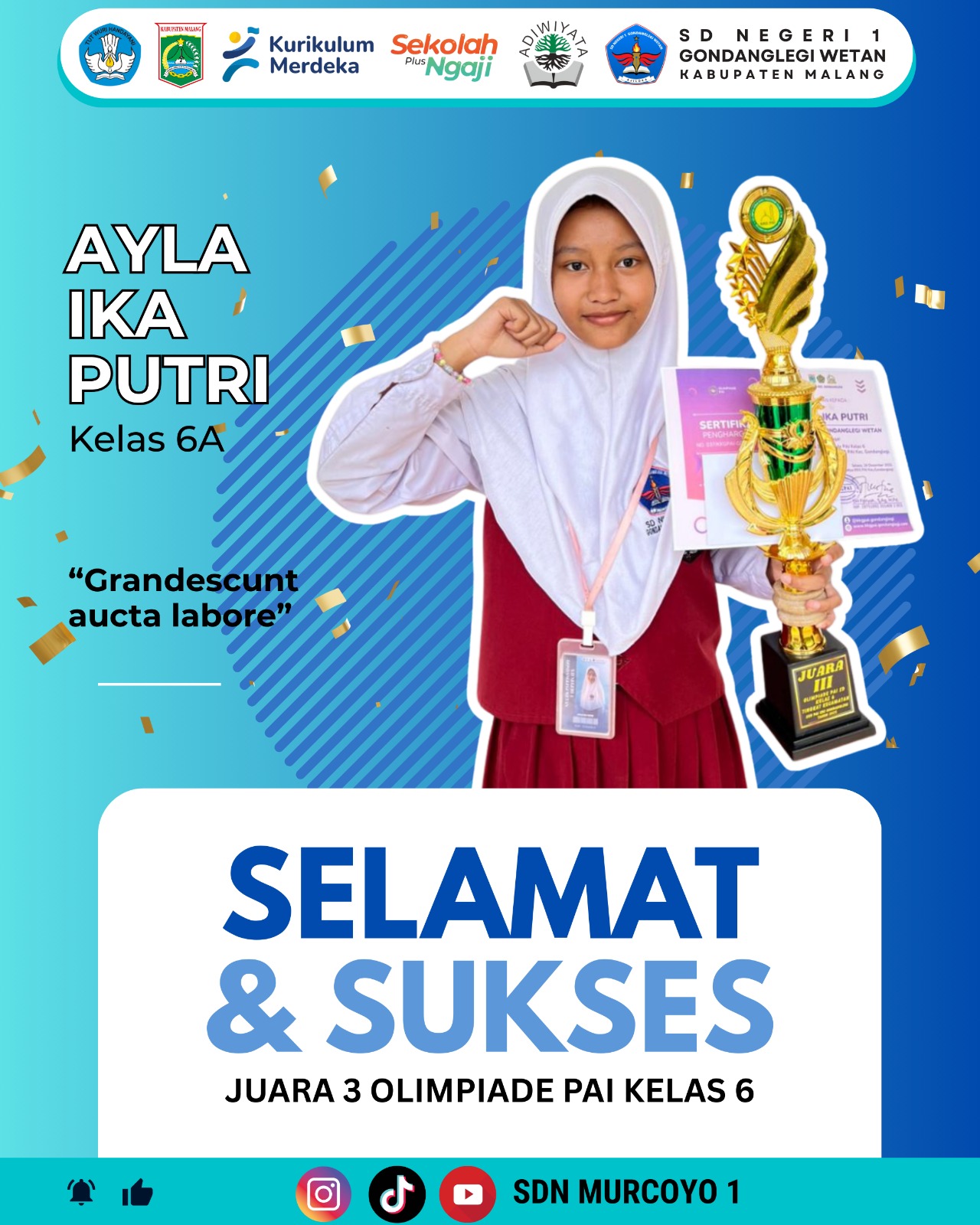 Prestasi membanggakan kembali diraih oleh peserta didik SD Negeri 1 Gondanglegi Wetan. Ayla Ika Putri, siswa kelas 6A, berhasil meraih Juara 3 Olimpiade Pendidikan Agama Islam (PAI) Kelas 6. Semoga prestasi ini menjadi motivasi untuk terus belajar, berakhlak mulia, dan meraih prestasi yang lebih tinggi di masa mendatang.